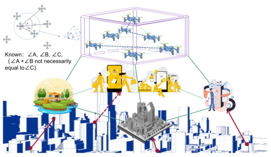 Considering that there are complex environmental situations and frequent electronic interference in the UAV application environment, and traditional UAV autonomous control technology and GPS cannot meet the existing needs, GPS errors will accumulate over time during the positioning process, and the accuracy will gradually be affected by the inertial navigation system, which is obviously not applicable in dense UAV swarms [3,4,5]. Therefore, we can gradually apply passive positioning to the internal communication of actual UAV swarms. According to the characteristics of passive localization, when in closed UAV swarms, passive positioning only requires several UAVs to act as BSs to transmit signals outward, and then other UAVs can passively receive signals to realize their own positioning, which only needs to be based on communication characteristics. From the perspective of users, this way of positioning can effectively protect and hide UAV swarms [6,7,8].