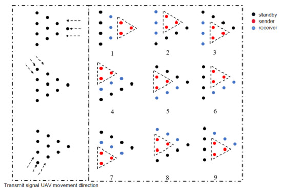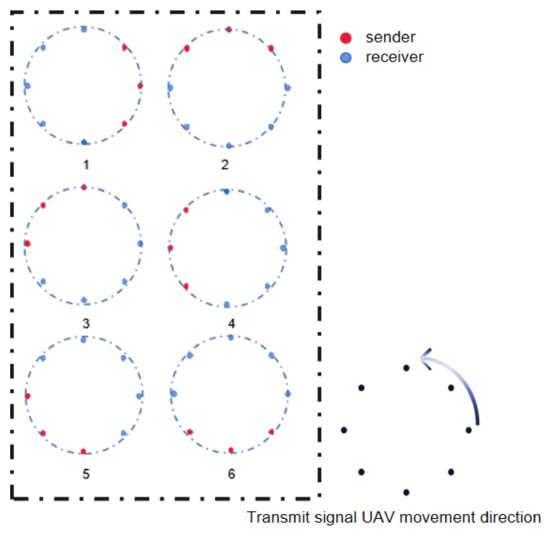 As shown in Figure 1, we consider a UAV air-to-air (A2A) model for independent edge communication via 6G, and the UAV swarm is ordered; that is, each UAV has a specified relative position (SRP) which is known to UAVs. Among them, everyone has simple half-duplex communication capability and limited computing power. However, during the flight, due to various reasons, there are always some small deviations from the SRP. Therefore, the UAV swarm maintains an overall relatively orderly state with local fluctuations, which means although SRP is known, the actual location needs to be determined through communication. In addition, this article assumes that the model is in an area where GPS is not available, and there is no external signal to assist communication during the flight, so the UAV swarm performs positioning, formation adjustment, and communication through the A2A internal link. On the other hand, there are only a limited number of UAVs transmitting signals which do not contain valid information, such as the source UAV number, distance, etc., acting as aerial base stations (ABSs) according to certain rules at the same time, and other UAVs act as APs to passively receive the approach angles of signals.