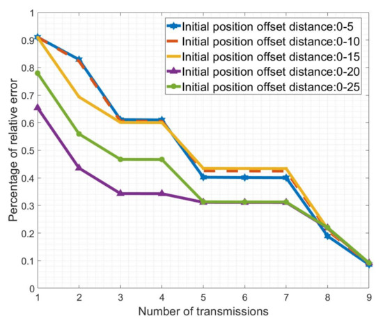 In Figure 4 and Figure 5, we calculated the errors of different ranges: 0–5, 0–10, 0–15, 0–20, 0–25, etc. Each range has two characteristics of the normal distribution and mean distribution. Figure 4 reflects the absolute error in the process of UAV course correction, and it describes the relative error in the process, that is, the ratio of absolute error to its expectation. We can clearly see that although position error after iterations will increase accordingly; they all converge in the end and stabilize below two unit lengths. At the same time, combined with the error ratio curve in Figure 5, we can see that the ratio between final error and distance is stable at about 0.1, so the algorithm for adjusting position is considered to be excellent.