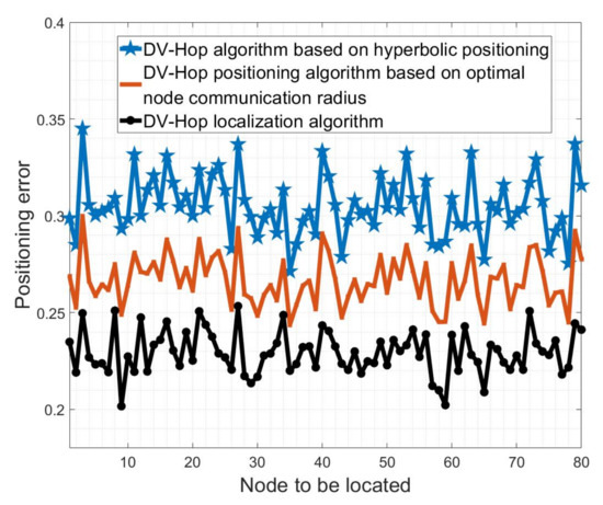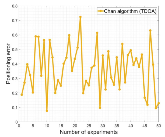Then, we compared the errors of other algorithms. After our many experiments, we obtained the performance trend of the commonly used DV algorithm and TDOA algorithm. The performance of the above algorithm is independent of the number of iterations, and multiple trials are only to avoid accidental events. Detailed experimental results are found below. Figure 6 shows three improved DV-hop positioning algorithms, among which the error of the algorithm with the best performance is still above 0.2. Figure 7 is the TDOA algorithm based on Chan’s law. We have calculated the error under different numbers of positioning points. It can be seen that the error ratio of the algorithm fluctuates between 0.1 and 0.7. From the trend in the graph, we can see that the error fluctuates between 0.1 and 0.7, and only a few specific experiments have an error below 0.1.