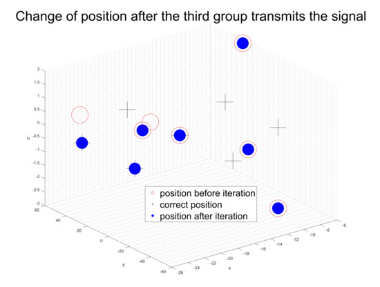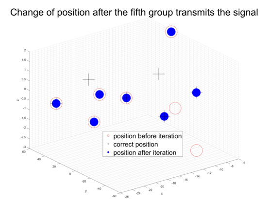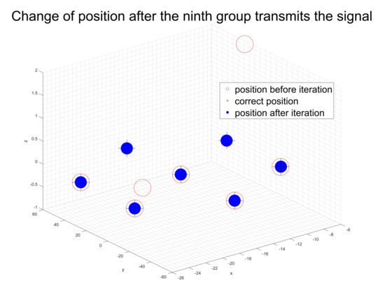 Last, we chose a case where the initial error is between 0 and 15 unit lengths and which follows normal distribution to show the iterative process. Figure 8, Figure 9, Figure 10 and Figure 11 shows that when we transmit signals according to the rule of Figure 2 and Figure 3, after the ninth group of UAVs completes launch, the flight array basically returns to its correct position, so the algorithm can realize the position adjustment within one complete iteration.