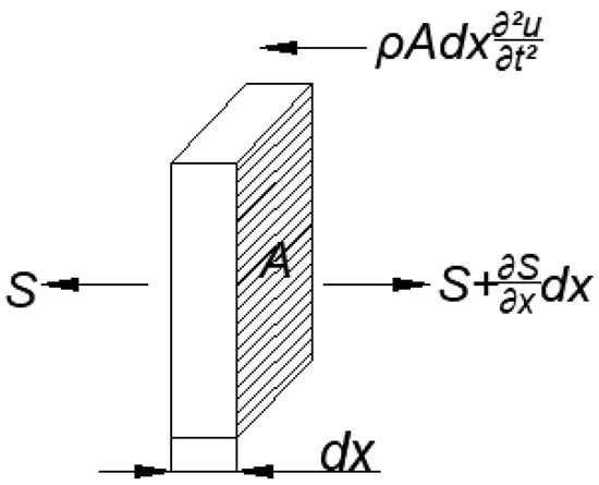 The longitudinal vibration model of the pipe is shown in Figure 2, where u denotes the longitudinal displacement at a point on the cross-section at x, S denotes the combined axial stress at the cross-section at x, A is the cross-sectional area, and ρ is the mass density of the material.