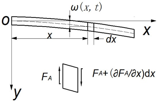 The pipe shear vibration model is shown in Figure 3. Let the longitudinal axis of the pipe before deformation be along the axis, the horizontal axis be the axis, the displacement of the center of the cross-section with coordinates along the horizontal axis be ω(x, t), and the shear force FA on the cross-section be proportional to the shear strain γ = ∂ω/∂x [], and then the following equation is obtained: