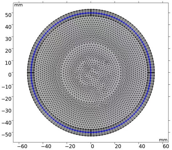In order to observe the spatial distribution modes that can exist on a long-distance waveguide at a given frequency, the DLLFP is simplified into a two-dimensional model, and the infinitely long DLLFP is modeled into a two-dimensional model wizard. The main consideration is the influence of the medium in the tube on the pipeline; thus, the pipeline is placed in a vacuum environment. In the developed model, the two pipe walls are specified as Layer 1 and Layer 2 from inside to outside. The inner diameter of Layer 1 is set at 0.0475 m and the outer diameter of Layer 1 at 0.05 m. The inner side of Layer 2 touches the outer side of Layer; thus, the inner diameter of Layer 2 is also set at 0.05 m, and its outer diameter is set at 0.053 m. The liquid in the pipe is water, Layer 1 is made of structural steel, and Layer 2 is made of Titanium beta-21S. The free triangular meshing technique is used to delineate the mesh of the pressure acoustic domain, with the mesh size selected from the hyperfine configuration. The outer layer of the pipe wall is divided into grids using mapped distribution, and the number of distribution cells is set to 5. The contact boundary between Layer 1 and Layer 2 is set as a continuous contact pair, and the outer wall of Layer 2 is set as a free boundary condition. The two-dimensional model of the DLLFP is shown in Figure 4, and the selected boundary is the continuous pair boundary.