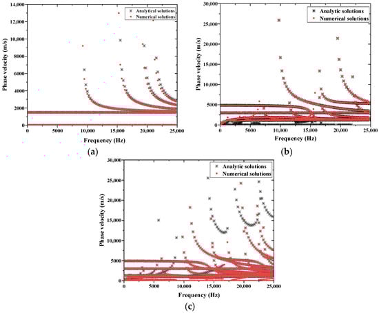 Given that the dispersion curves vary as the physical fields differ, and to verify the correctness of the calculation procedure, numerical simulations are performed on the DLLFP shown in Figure 4 under different physical fields and the numerical solution is compared with the analytical solution. The analytical solution is used to embed the wave number formula derived in the paper into COMSOL Multiphysics are used for calculation to obtain the analytical results of the dispersion curve. Through parametric scanning, the excitation frequency is scanned from f0 = 10 Hz to fmax = 25 KHz, and the scan step is set to 249.9 Hz. The mode analysis frequency is given as f0 = 10,000 Hz for the interior of the pipe, the mode search method is set to the manual search method, the APPACK solver is selected as the mode solver, and the mode search base k0 = 2πf0/c0. The numerical simulation is solved using the MUMPS direct solver, which requires higher memory usage compared to iterative solvers, but is more robust. The free triangular meshing technique is chosen to divide the mesh in the pressure acoustic domain. The solid mechanics domain is selected to divide the mesh by mapping distribution, and the number of cells of the whole geometric mesh is 6638. The physical fields are the pressure acoustic domain, solid mechanics domain, and acoustic–structural coupling domain. The fluid inside the DLLFP is water, the x-axis is the scanning frequency in Hz, and the y-axis is the phase velocity value in m/s. The black asterisk line indicates the dispersion curve obtained with analytical calculation, and the red dot line indicates the dispersion curve obtained with numerical simulation. The dispersion curves of different physical fields are shown in Figure 5.