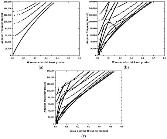 Relationship between wavenumber–thickness product and angular frequency of DLLFP. (a) Pressure acoustic domain. (b) Solid mechanics domain. (c) Acoustic–structural coupling domain.