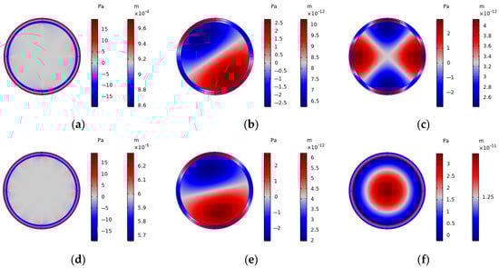After the sound pressure distribution clouds are summarized, some of the sound pressure distribution clouds under the coupled domain sound field are shown in Figure 8. The (2,0) mode simple positive wave shown in Figure 8c is found to occur intensively in the high-frequency phase of f = 17,503~25,000 Hz. The (1,0) mode simple positive wave shown in Figure 8b appears intensively in the intermediate phase from f = 12,755~19,502 Hz. While the sound pressure distribution is shown in Figure 8a for the through mode, the (2,1) mode simple positive wave in Figure 8f is shown almost throughout. Figure 8 also shows that the sound pressure distribution of the straight-through mode is plotted as a cloud with a frequency f = 5008 Hz and a wavenumber k = 10.619. The straight-through mode appears again in a frequency f = 20,002 Hz and a wavenumber k = 41.412, which proves that the straight-through mode is present across the full spectrum of frequencies. A comparison between Figure 8b,e reveals that the phase of the sound pressure distribution cloud varies with frequency. Different propagation modes appear in different frequency bands because of the difference in their respective cut-off frequencies. As the wavenumber increases, the sound pressure increases along the radius; in the high-frequency part, the overlap of different propagating guided wave modes makes the sound pressure distribution more complex.