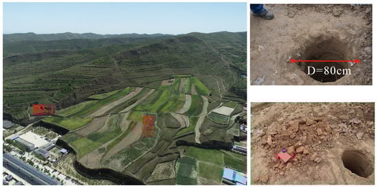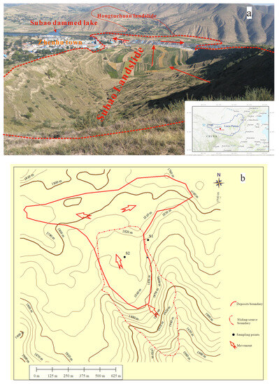 The Subao landslide is located approximately 25 km southwest of Xiji city, Ningxia Hui Autonomous Region, China. The shortest distance from the study site to the seismogenic fault Haiyuan fault zone is about 62 km, which is in the level IX area of the 1920 Haiyuan earthquake [7]. An overview of the study site is shown in Figure 1a. The boundary between the landslide accumulation mass and the landslide is clear. The deposit is flat with a gradient of 2°. The middle and upper part of the deposit is farmland, with slight disturbance, and the lower part is a village, with serious disturbance. The front part of the deposit moved along the muddy river to both sides and formed Subao dammed Lake, with the sliding mass of the Hongtuchuan landslide on the opposite side. Figure 1b presents the topography of the landslide area. The landslide has a maximum width of about 360 m and a length of 1320 m. The thicknesses of the deposit were inferred to be approximately 20~45 m in different areas, and the average deposit thickness is 30 m. Respectively, the total volume of the Subao landslide is about 1.2 × 107 m3. The main scarp of the landslide is high and steep, with a height of 80 m and gradient of 50°. We found mudstone exposed under the main scarp. Our observations suggest that the movement type of the landslide is translational sliding based on the Varnes’ classification system [14], and the type is a loess–bedrock Interface slide based on the Li’ classification system [28].