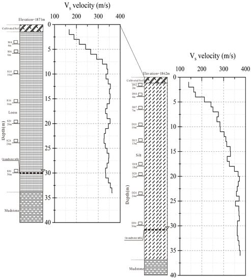 The soil profiles of the landslide source and deposition are shown in Figure 3 with the corresponding sample points and shear wave velocity (Vs). The top elevation of S1 is 1871 m with 34 m of the soil. Apart from a thickness of 1.6 m for the top cultivated soil layer, a thickness of uniform loess is about 32 m, which is commonly designated as Q3 loess (Malan loess), based on the formation age and physical properties. The lower part is mudstone, which has low permeability and high strength. The stable groundwater level is 30 m below the ground. We sampled at the depths of 4 m, 6 m, 10 m, 16 m, 20 m, 24 m, and 30 m, respectively, and the number is S04, S06, S10, S16, S20, S24, and S30. The upper part of the S2 is cultivated soil with a thickness of 1.8 m, and the lower part is loess-like soil with a thickness of 35 m. Similarly, the stable groundwater level is 30 m below the ground. The depths of the 2 m, 4 m, 7 m, 10 m, 13 m,18 m, 20 m, 24 m, and 30 m soils were sampled respectively, and the number is D02, D04, D07, D10, D13, D18, D20, D24, and D30. In addition, shear wave velocity tests of two pits were conducted via the signal hole method. The results, as shown in Figure 3, present the shear wave velocity as increasing rapidly from the ground to a depth of 7 m, and the oscillation increases slowly below the depth of 7 m in S1. The average shear wave velocity in the upper 30 m (VS30) is 306 m/s. And, the shear wave velocity increases from the ground to a depth of 14 m, and the oscillation increases slowly below the depth of 14 m in S12. The average shear wave velocity in the upper 30 m (VS30) is 288 m/s.
