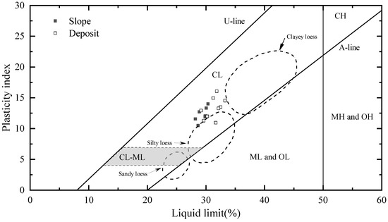 Soils with a higher proportion of smaller particles typically exhibit higher liquid limits. As shown in Figure 7, according to Gibbs’ classification method based on the liquid limit and the plasticity index, both the undisturbed loess and landslide deposit fall between the A-line and U-line. The undisturbed loess has a lower liquid limit, closer to silty loess, while the landslide deposit has a higher liquid limit, closer to clayey loess. The liquid limit test results are consistent with the particle analysis results.