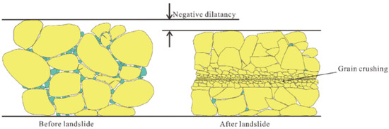 Based on the variations in the pore structure and particle size of the undisturbed loess and landslide deposits, it can be inferred that during the occurrence and movement of a landslide, the loose and porous structure of the undisturbed loess undergoes fragmentation. Larger soil particles experience compression, friction, fragmentation, and abrasion during their movement, resulting in the formation of smaller particles (Figure 8). Additionally, as the landslide progresses, continuous collisions among larger particles cause them to move downward, leading to further fragmentation and abrasion. Simultaneously, smaller particles are more easily transported via the surrounding soil and water flow, tending to settle in the lower sections of the landslide deposit. Consequently, the lower parts of the landslide deposit might contain a higher proportion of smaller particles. This phenomenon can be attributed to the combined effects of the fragmentation and abrasion of larger particles during their movement and the selective transportation and deposition of particles of different sizes during the landslide process.