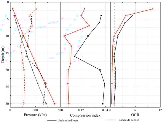 The undisturbed loess has a strong structural behavior at a low water content, which is manifested as a state of over-consolidation, i.e., OCR is much greater than 1. As the water content of the soil sample increases, the structural behavior of the loess gradually weakens, and OCR tends to approach 1, which is manifested as a normal consolidation [33]. As shown in Figure 9, the initial pre-consolidation pressure of the undisturbed loess is notably higher than the vertical stress at the depths exceeding 5 m. With the increasing depth and moisture content, the pre-consolidation pressure and vertical stress gradually converge. This trend aligns with the typical understanding of the dynamic consolidation pressure in loess. The compression index ranges from 0.13 to 0.33, indicating a soil of moderate compressibility.