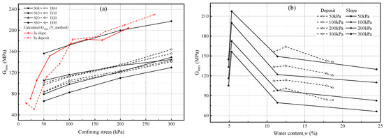 In this study, as shown in Figure 11b, when the moisture content of the intact loess is below its plastic limit, Gmax initially increases and then rapidly decreases as the moisture content increases. With further increases in the moisture content, the rate of the Gmax attenuation slows down, and Gmax gradually stabilizes as it approaches saturation. This trend remains consistent under different confining pressures. However, the landslide deposit is less sensitive to the changes in the moisture content, and the attenuation trend of Gmax is relatively gradual. Regardless of the confining pressure, the Gmax of the landslide deposit is greater than that of the intact loess at the same moisture content. The results indicate that the sensitivity of the landslide deposit to the moisture content is weaker compared to the intact loess. This difference in sensitivity could be attributed to the variations in the material composition, particle arrangement, and structural characteristics of the deposit.