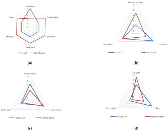 Figure 1a shows the self-defined profile of the two analyzed coaches using the COQ. The first coach presents a predominantly traditional profile, moving away from innovative and technological aspects. On the contrary, the second coach of the team presents a mainly technological/innovative profile, as he is characterized by the inclusion of recently created methods and confirms his worth through technology. In addition, he used technology in training sessions with the aim of quantifying and controlling the loads to which the players are exposed.