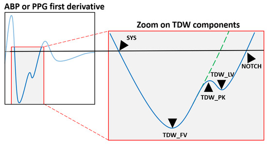 Morphological detail of tidal wave region from first derivative analysis of ABP or PPG waveform. Black line represents zero value. Green dotted line represents gradient convergency to zero value in absence of tidal wave phase. TDW components are highlighted by pointing triangles.