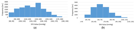 (a) Histogram for selected SYS values; (b) histogram for selected DIA values.