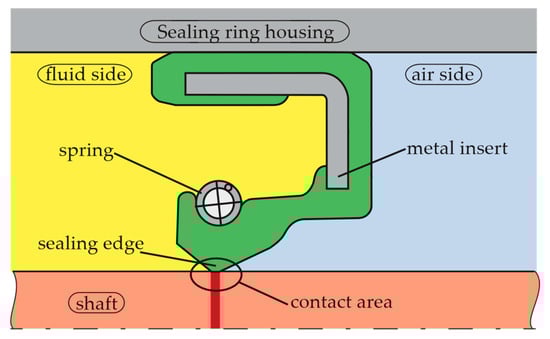 In many technical applications, seals are required to keep lubricants and operating fluids within a system as well as to keep contaminants out of this system. Rotary shaft seals (RSS) are mainly used to seal pressureless shaft passages that are splashed or flooded, e.g., in automotive and mechanical engineering [1,2]. The rotary shaft seal is a complex tribological system that includes not only the sealing ring, but also its counterface, i.e., the shaft surface, and the fluid to be sealed [1]. The sectional view of a rotary shaft seal made of elastomer according to DIN 3760 [3] or ISO 6194 [2] is shown in Figure 1.