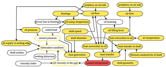 In the assembled state, the sealing lip is pressed against the shaft surface with the aid of a garter spring. This results in a narrow contact area between the sealing edge and the shaft surface, with a contact width of about 0.1 mm [1]. The static sealing mechanism, i.e., when the shaft is not rotating, is additionally ensured by the interference of the shaft outer diameter and the sealing ring inner diameter [1]. When the shaft rotates, the lubricant to be sealed is dragged into the contact area between the sealing edge and the shaft. Due to the active sealing mechanism, this fluid entering the sealing gap is pumped back from the air side to the oil side. Various models have been suggested to explain this dynamic sealing mechanism of rotary shaft seals [4,5,6]. During operation, the contact area is subjected to friction. The more frictional heat is generated in the contact area and the less of this heat can be dissipated from the contact area, the greater the temperature in the contact area. The generation and dissipation of heat and, thus, the contact temperature is affected by numerous interacting factors, some of which are illustrated in Figure 2.