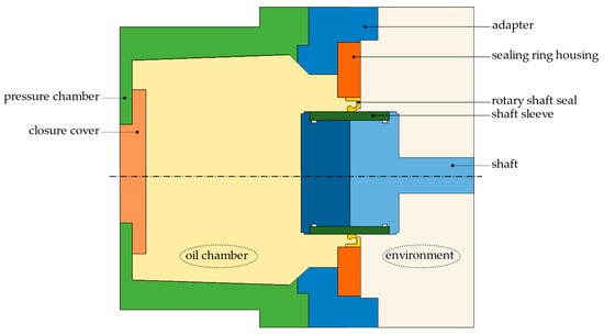 The tests used to validate the simulation model were performed on a high-speed friction torque test bench. The rotationally symmetrical geometry model used in the simulations was based on this test bench and consisted of a total of nine domains, which are illustrated in Figure 3. The domains pressure chamber, closure cover, adapter, sealing ring housing, rotary shaft seal, shaft sleeve and shaft were considered as solid bodies. The geometry of the sealing ring used on the test bench was simplified in the simulations: neither the spring nor the metal insert of the sealing ring were considered, and the entire volume of the sealing ring was assumed to be made of elastomer. Both the sealing edge and the shaft as the counterface were assumed to be ideally smooth. The sealing gap itself was not simulated, but the direct contact of the sealing edge to the shaft was assumed. The fluid domain oil chamber contained both oil and air, which is why a multiphase model was necessary to describe the two-phase flow. The fluid domain environment contained only the air.
