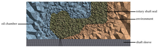 The geometry was meshed in the Ansys Workbench meshing software, Ansys CFX 2021 R2. An element size was specified for each domain. The sealing ring was meshed with the finest element size of 0.2 mm. To ensure a smooth transition to the surrounding domains and, thus, to other element sizes, the mesh size at the interfaces of the sealing ring was also set to 0.2 mm. Over the 0.2 mm wide contact width between the sealing edge and the shaft sleeve, the number of elements was set to 8 elements. The domains environment and oil chamber were meshed with an element size of 1 mm. The largest mesh size of 4 mm was defined for the domains pressure chamber, adapter and closure cover. The used mesh contained 60.5 million elements and 13.7 million nodes. Due to the limited computing power available, the mesh was not further refined. Figure 4 shows the mesh in the area of the sealing edge. The domains rotary shaft seal, oil chamber and environment were meshed with tetrahedrons; all other domains were meshed with hexahedrons.