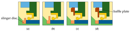 Simulated configurations with slinger disc and baffle plate. (a) SD_small. (b) SD_large. (c) BP_small. (d) BP_large.