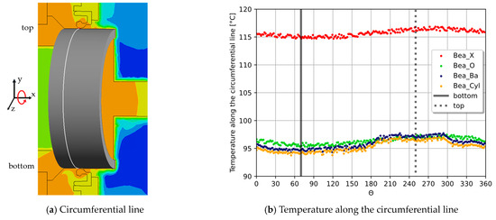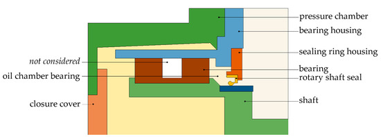 The maximum temperatures, which are the main focus of the simulation, were found in the contact area between the sealing ring and the shaft. Due to the distance to the contact area, the geometry of the bearings was assumed to have no great influence on the contact temperature. Thus, to keep the simulation setup as simple as possible, the same geometry model was used for the simulations of the four variants with bearings, as shown in Figure 7.