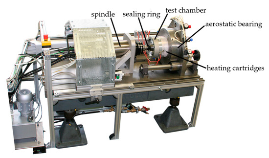 The high-speed friction torque test bench shown in Figure 10 was used for the experiments [30]. The basic design of the test bench consists of a spindle driven by a motor, on which the shaft is mounted, and an aerostatic bearing into which the test chamber is mounted. The motor can realize speeds of up to 24,000 rev/min. The entire test chamber can be moved along linear guides. By adjusting the trapezoidal spindle, different positions of the shaft can be set, for example to test the variants with shoulder design. The aerostatic bearing allows the chamber to rotate around the center axis with minimal friction, which is required to prevent the measurement of a falsified frictional torque. The chamber is supported by a lever arm acting on a load cell. The friction generated at the seal is, thus, passed on to the chamber and measured via the load cell. Before starting the test, the oil chamber was filled with oil up to the center of the shaft and then closed with a vent valve. The temperature of the oil inside the oil chamber was monitored with a temperature sensor PT 100. The test-bench control regulated heating cartridges to keep the oil temperature at the desired temperature. For the experiments in the scope of this study, the temperature of the oil was heated to = 80 °C. In order to obtain measurement results at different shaft speeds, a speed duty cycle, in which the speed was increased in predefined steps, was run after a twelve-hour run-in phase. Both the frictional torque and the temperature in the contact area were measured at each speed level in the last few minutes of a 30 min speed step in the speed duty cycle.