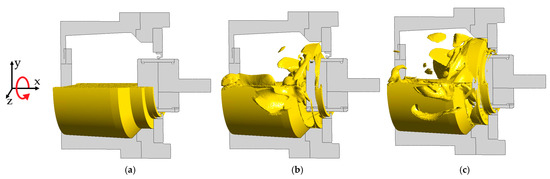 Different pumping effects could be observed for different bearings. In the case of the tapered roller bearings, the fluid was pumped towards the larger diameter of the taper [39]. In the X-arrangement, the fluid located between the sealing ring and the bearings was pumped away from the sealing ring. In the O-arrangement, the fluid was pumped towards the sealing ring. For the variants with bearings, there were two fluid domains filled with oil and air: the domain oil chamber and the domain oil chamber bearing. Depending on the bearing and its pumping effect, a different amount of oil reached the domain oil chamber bearing. Thus, the only differences between the variants with bearings were the following: