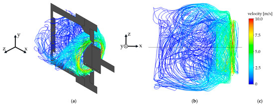 The advection scheme “High resolutions” was used. This defines how the advection term in the transport equation is modeled numerically. The “High resolution” scheme keeps the solution as close to the second order as possible. To under-relax the equations of the steady-state simulation as they iterated towards the final solution, a false time step was applied [37]. As a fluid timescale control, the option “Auto timescale” was defined. With this option, the solver calculates the timescale based on the defined boundary conditions, initial conditions or the current solution. The same option was used for the solid timescale. This automatically calculates the solid time scale based on the length scale, thermal conductivity, density and specific heat capacity. The timescale in the solid domains, without any flow, was defined separately, because these timescales can usually be much longer.