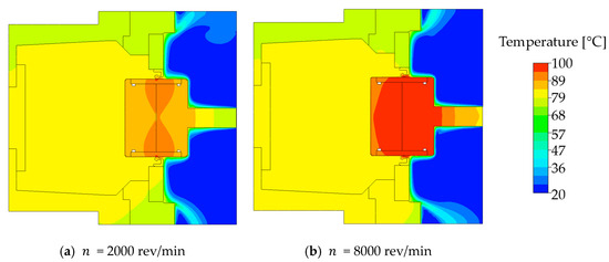 Except for the fluid domain environment, each domain was initialized with the initial temperature = 80 °C. This corresponds to the oil sump temperature at the test bench, to which the oil was heated during the experiments. The domain environment was initialized with the ambient temperature = 20 °C. For the boundary condition on the outer side of the domains pressure chamber and adapter/bearing housing, the heat transfer coefficient = 42.5 W/(m·K) was specified as the boundary transition to the ambient temperature . A subsonic opening boundary condition was defined at the system boundary of the domain environment. Thus, the fluid in this domain, the air, was allowed to cross the boundary surface in either direction. The flow over the boundary did not have to be normal to the surface. The static pressure was specified as 0 Pa over this boundary. To represent the holder of the spindle and, thus, a wall, the axial system boundary of the domain environment was defined as a no-slip wall. This meant that the velocity of the air at this boundary was set to zero. Due to the adiabatic option, this wall allowed no heat transfer across the wall boundary.