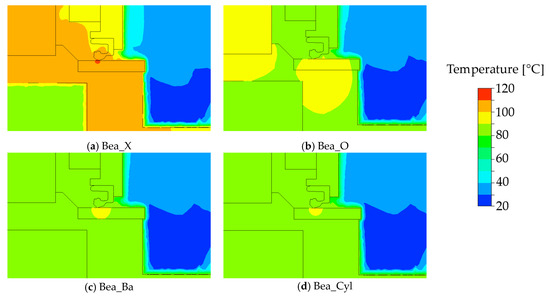 The computer-aided designs (CAD) of the first four variants in Table 2 are shown in Figure 5. For the variants with a baffle plate, seen in Figure 5c,d, the volume between the baffle plate and the cover was not considered in the simulations. The boundaries to this volume are adiabat. Two different arrangements of tapered roller bearings, the X-arrangement and the O-arrangement, ball bearings and cylindrical roller bearings were tested on the test bench. The sectional views of the geometries of the four-bearing arrangements are shown in Figure 6. The diameter of the bearings was the same for all four.