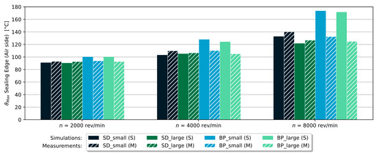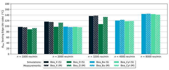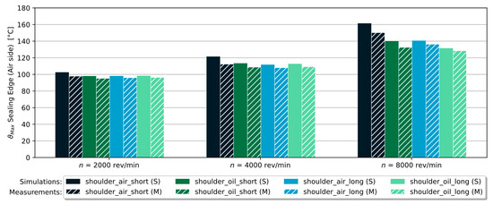 Failures of rotary shaft seals and, thus, of the entire system are often caused by the overheating of the contact area. An increase in temperature in the sealing contact of about 10 K can already lead to a significantly reduced service life of a rotary shaft seal [8]. Therefore, in order to better assess the risk of a temperature-induced failure and to achieve a long service life, the temperatures in the contact area must be below the operating temperature limit of the sealing ring and the fluid. The contact temperature to be expected during operation must, thus, be known as accurately as possible. In general, it can be distinguished between three different ways of determining the contact temperature. The first option is to measure directly on a real component [9]. This is usually the most accurate method for determining the contact temperature, but these measurements can be extremely difficult or even impossible due to the very small gap heights between the sealing edge and the shaft. Furthermore, a prototype must already have been manufactured. For an initial design, before a prototype is manufactured, these measurements, therefore, cannot be performed. The second option is the possibility of estimating the temperature in the contact area without a prototype by using an approximation equation [7,10,11]. This can be conducted, for example, with the InsECT beta-18.10.08 [12,13] calculation tool developed at the Institute of Machine Components of the University of Stuttgart. In the current state of development, this tool is not applicable to sealing systems with certain configurations, such as rotary shaft seals with a protective lip or coated shafts, hollow shafts or shafts with sleeves. The third option is to simulate the entire system. Through simulations, the expected contact temperature can already be developed for the first design without the need to build a prototype. This offers the possibility to simulate different variants and compare them with each other. Moreover, the results are more accurate than when using approximation equations. Depending on the complexity of the simulation model, i.e., how many influencing factors are considered, the development of the simulation model can be extensive and, thus, require a great amount of time.