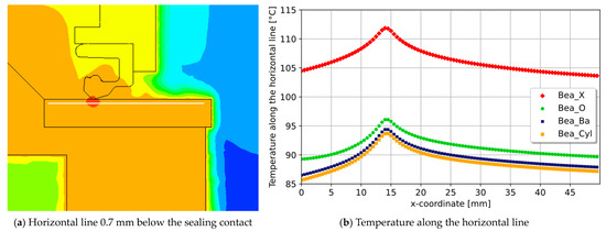 In reality, the heat calculated by Equation (17) is generated in the sealing gap between the sealing ring and the shaft surface. Since the thermal conductivity of the sealing ring is extremely low compared to the thermal conductivity of the shaft, more heat is transferred from the sealing gap to the shaft than to the sealing ring. In the simulation model, the sealing gap was not considered; instead, the direct contact between the shaft surface and the sealing edge was assumed. In order to realize the uneven heat transfer to the sealing ring and the shaft in the simulation model, the frictional heat flux calculated by Equation (17) was divided into two parts. A larger part of the heat flux was specified as a heat source at the shaft surface. A much smaller heat source was specified at the sealing edge. Thus, the frictional heat flux determined by Equation (17) was divided using a heat partition factor which is defined as