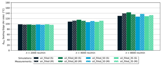 A total of 17 different simulations were performed in the computational-fluid-dynamics (CFD) software Ansys CFX 2021 R2. One reference configuration and 16 geometric variations were used. Due to the heat transfer between the solid domains and fluid domains in the model, the conjugate heat-transfer (CHT) method was used. This method calculates the temperature distributions in both the fluids and the solids. The flow in the sealing gap was neglected. Due to the interaction between the oil and air in the oil chamber, a multiphase flow was considered. To validate the results obtained from the simulations, experiments were performed on a test bench at the institute.