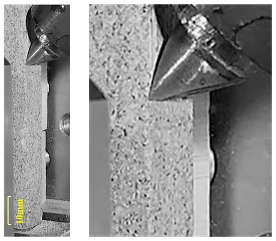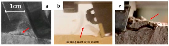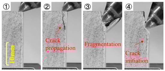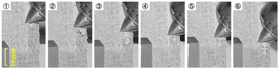 In order to study the special phenomenon of fragment breaking apart in the middle, the following experiment was designed with reference to the ductile-small fragmentation-brittle phase mentioned in Zhang’s research []. This study focuses on the initiation and propagation of cracks, so it does not conduct in-depth research on plastic failure in rock cutting. For the experiments, four cutting depths, 0.5 mm, 1.5 mm, 2.5 mm, and 3.5 mm, and three experiments under each depth, were used, and the crushing circumstances are depicted in Figure 3, Figure 4, Figure 5 and Figure 6. As can be seen in the figures, no macroscopic fissures and no big rock fragmentations were created when the cutting depth was 0.5 mm. Instead, the crushed rock fragmentation just exited the crushing zone via gravity. When the cutting depth reached 3.5 mm, the rock sample was invaded at the drill teeth’s point of contact, causing the rock to sprout cracks. These cracks then spread along the drill teeth’s velocity direction to form macro cracks, which eventually turned into semi-dislodged rock fragmentation before falling off.