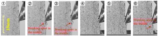 To investigate the development process of fractured cuttings, the fifth fragment (Figure 15 (⑤)) from the DOC = 2.5 mm was selected for the playback of the fracture process, as shown in Figure 17a.