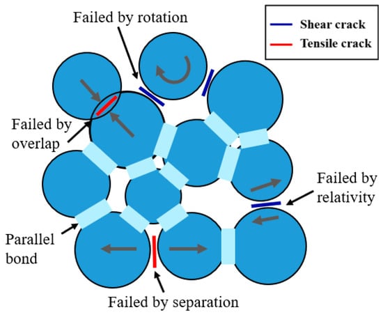 If relative movement occurs at the contact after bonding is established, the elastic interaction can impart force and torque. The force and torque act on the contacts of two bonds and are associated with the maximum normal and shear stresses acting around the bond and within the bonded material. The particle model exhibits linear elastic tensile, compressive, and rotational behavior. If the stress of the bond exceeds the limit of its corresponding strength, the bond fracture will occur. The bonding material corresponding to the fractured bond and its accompanying forces, torques, and strengths are removed from the model, and the fracture degenerates into the linear contact models, resulting in tensile and shear cracks in the model [,]. The Discrete Fracture Network was used to separate the tensile crack from the shear fracture in order to better understand the mechanism of crack initiation and expansion in rock cutting. The principle is shown in Figure 8. There are four reasons for bond fracture, which are rotation, interleaving, separation, and overlap. Among them, the bond fracture caused by rotation and interleaving will produce a shear crack in situ, and the bond fracture caused by separation and overlap is a tension crack.