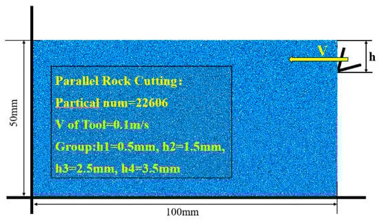 In this research, parallel cutting tests were conducted in four groups of continuous cutting experiments, with each group’s depth being varied. The designed experimental model and the loading mode are shown in Figure 6. The variable for the parallel cutting experiment was the depth of cut (DOC), with four experimental groups of h1 (1D, D is the mean diameter of the particles, D = 0.5 mm), h2 (3D), h3 (5D), and h4 (7D). Multiple PCFs were recorded, respectively, for each experiment and the total number of cracks, debris particles, and NFs, and the corresponding cutting lengths for each set were also recorded. The process of generating parts of the rock fragmentation was replayed.