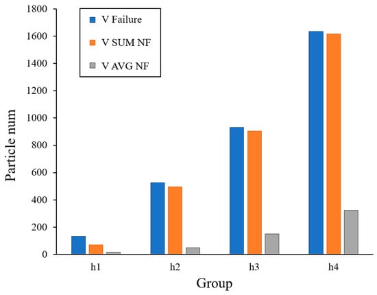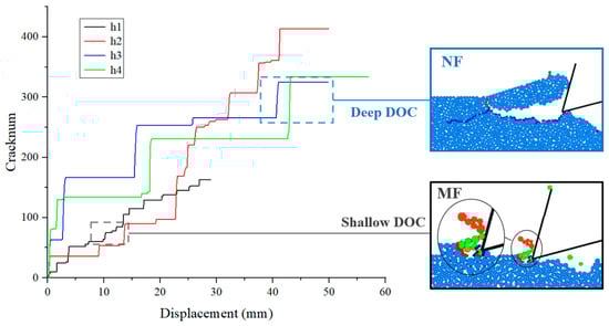 As shown in Figure 11, the relationship of rock fragmentation particles between group of shallow DOC h1 and group of deep DOC h2, h3, and h4 is calculated. It can be observed that MF is dominant in shallow DOC, whereas NF is dominant in deep DOC, which complies with the results of previous rock-cutting experiments and simulations []. It is worth mentioning that there are more MFs in the h2 group, and the staggered pattern of large and small steps is also shown in Figure 7.