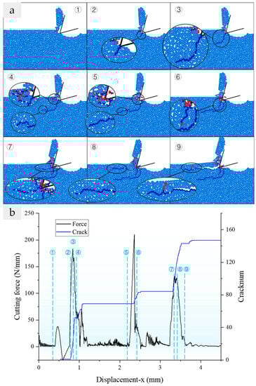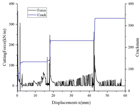 Figure 12 illustrates a straightforward examination of the cutting force and fractures using a simulation with 3.5 mm DOC. It can be investigated that the existing time for the Peak Cutting Force (PCF) in the numerical simulation is quite short. The cutting force reaches the peak value at the moment before the crack number increases sharply, which is consistent with the release of a large amount of strain energy after the crack propagation, as described in the previous research, resulting in a steep drop in the contact force of the rock-breaking tool. The development of fragmentation during rock cutting is demonstrated to be a periodic progressive failure [].