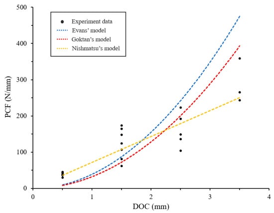The multi-cutting PCF at various depths is derived from a numerical simulation of rock cutting. The single PCF is easily affected by the damaged crack, and the damaged area of the previous cutting is more unstable. It can be understood that the strain energy of the next rock cutting corresponding to the crack is released in advance, so the PCF of the same set of experiments is chosen for the analysis. The following three PCF models are chosen for investigation referring to the previous methods of studying peak cutting force [,,,].