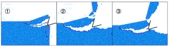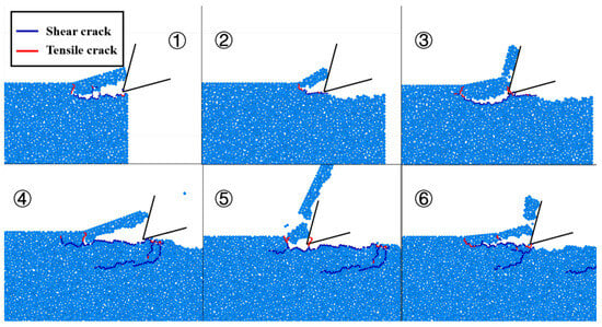 An interesting phenomenon is visible in the image above. The crushing zone resulting from the contact between the front section of the tool and the rock is accompanied by secondary cracks causing damage to the interior of the rock, in addition to the initiation cracks sprouting on the boundary. Moreover, the primary fracture might split in the middle, which can also result in secondary cracks that can also cause harm. According to the simulation results, damage cracks can be classified into two categories. One is to influence the shape and even more of the rock fragmentation after the cutting direction, as shown in Figure 14 (⑤) and Figure 15 (②,③,⑤). The other is damage cracks that do not expand in the direction of cutting velocity towards rock substrate, as shown in Figure 14 (④,⑥), Figure 15 (①), and Figure 16 (①). Next, the characteristics of the rock fragmentation are selected for the process analysis.
