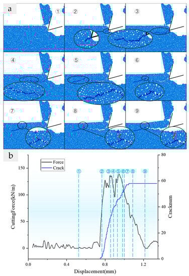 (a) Development Process of Crack in Damaged Cuttings; (b) Formation Process Force and Crack of Damaged Cuttings. (Group h2, fourth fragmentation).