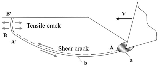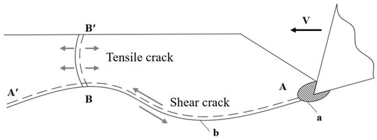 As shown in Figure 20, when the tool contacts the rock and with the advancement of the tool, the area of contact between the tool and the rock produces crush zone a. The main shear fracture AA’ is formed when the critical number of macro-crack propagation is attained. The main crack expands some distance in the direction of velocity, followed by a long strip of semi-detached rock fragmentation. At this stage, secondary fracture BB’ formed and spread from weak fragments, as semi-detached rock fragmentation was caused by the action of rock substrates and cutters under pressure. The secondary cracks extend to the free surface, and the semi-exfoliated cuttings are tensioned to form intact rock fragments. The cuttings are ejected to form an excess crushing zone b, and the tool moves forward without substantial resistance until it reaches the rock again to begin the next cut.