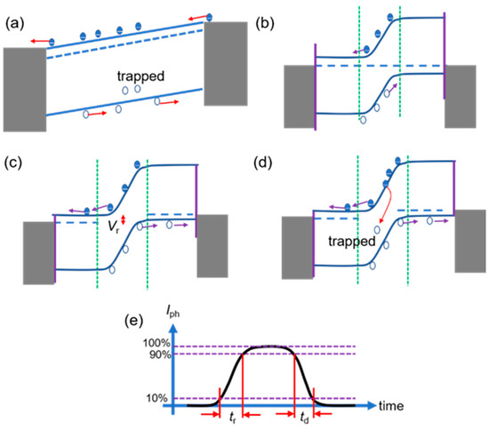 Schematic for gain and response time. (a) Photogenerated carrier transport in a photoconductor. (b–d) Photogenerated carrier transport in a photodiode. (b) Zero bias. (c) Reverse bias. (d) Reverse bias with hole traps in the depletion region. (e) Response time diagram. Rise time: tr. Decay time: td.