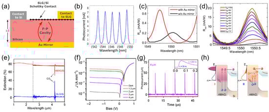 The detection spectral range of the graphene/Si heterojunction photodetectors is primarily determined by the Si component, as graphene typically serves as the transparent electrode. However, graphene can also act as a photosensitive material. When photoexcited carriers are generated in graphene, they can be emitted to Si across the Schottky barrier, a process known as internal photoemission, enabling the detection of light with photon energy higher than the Schottky barrier [85]. Despite graphene’s broadband spectral absorption capabilities, its absorption of incident light is extremely low, resulting in a weak photoresponse to light beyond the absorption edge of Si. To overcome this limitation, Casalino et al. designed a resonant cavity structure to enhance the light absorption in graphene at 1550 nm, as schematically shown in Figure 3a [86]. The spectral response of the detector without the Au back mirror is shown in Figure 3b, which shows pronounced wavelength-dependent periodic photocurrent peaks that align with the resonant characteristics of a Fabry–Perot cavity. By introducing a Au back mirror, the responsivity of the photodetector was increased by a factor of 3, accompanied by a blue spectral shift of the resonance wavelengths, as shown in Figure 3c. The photoresponsivity also exhibited a dependence on the reverse bias voltage, reaching approximately 20 mA/W at a bias voltage of 10 V near 1550 nm, as shown in Figure 3d. In addition to resonant cavity structures, other forms of graphene have been used to construct broadband graphene/Si photodiodes [87]. For instance, Peng et al. fabricated a highly crystalline macroscopic assembled graphene nanofilm (nMAG) and transferred it onto the surface of Si, forming an nMAG/Si heterojunction photodetector [48]. The 45 nm thick nMAG displayed an extinction coefficient of 74–81%, corresponding to approximately 40% light absorption, as shown in Figure 3e. Furthermore, nMAG exhibited a long carrier relaxation time (~20 ps), a low work function (4.52 eV) and suppressed carrier number fluctuations, all of which are advantageous for achieving high-performance nMAG/Si heterojunction photodetectors. Under these circumstances, the device operated in the wavelength range of 1.5–4.0 μm at room temperature Figure 3f, demonstrating a fast response time, as shown in Figure 3g, and high detectivity under pulsed laser illumination. The spectral response of the photodetector extended beyond the intrinsic absorption of Si, indicating that nMAG played a significant role in the photoresponse. The specific photoresponse mechanism depended on the photon energy range, as illustrated in Figure 3h. When the photon energy exceeded 2.1 eV, the photogenerated electrons had sufficient energy to overcome the Schottky barrier and contribute directly to the photocurrent. Conversely, for photon energies below 2.1 eV, the photogenerated electrons thermalized into a Fermi–Dirac distribution, and only those electrons with energy above the Schottky barrier height could contribute to the photocurrent.