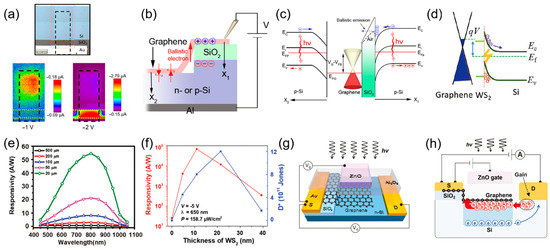Graphene/Si heterojunction characteristics concerning gain. (a) Photocurrent mapping of the graphene/n-Si device under different bias voltages. Reproduced with permission from Ref. [88]. Copyright 2017, American Chemical Society. (b) Schematic of the cross-section of the graphene/n-Si heterojunction. (c) Band diagram along different directions shown in (b). (b,c) Reproduced with permission from Ref. [89]. Copyright 2016, American Chemical Society. (d) Band diagram of the graphene/WS2/Si heterojunction under reverse bias and light illumination. (e) Responsivity as a function of wavelength for devices with different sizes. (d,e) Reproduced with permission from Ref. [93]. Copyright 2019, WILEY-VCH. (f) Responsivity and specific detectivity as a function of WS2 film thickness. Reproduced with permission from Ref. [94]. Copyright 2021, Royal Society of Chemistry. (g) Schematic of the gate-tunable graphene/Si photodetector. (h) Schematic of the device describing photocurrent component at negative gate bias. (g,h) Reproduced with permission from Ref. [95]. Copyright 2018, WILEY-VCH.