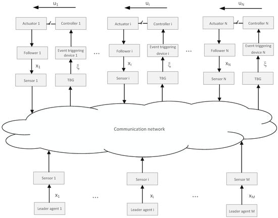 In order to achieve containment control, fixed time, and reduce communication burden, the controller is designed by using a time reference generator and event trigger. The event-triggered containment control framework for multi-agent systems based on wireless sensor networks and time base generators is shown in Figure 1. The follower obtains local information through the communication network, calculates the relative state error, and analyzes whether it satisfies the trigger condition, according to the trigger function, and then updates the control input. The control input’s UI can be transmitted from the controller i to the actuator i, and then the follower state is controlled and uploaded to the communication network.