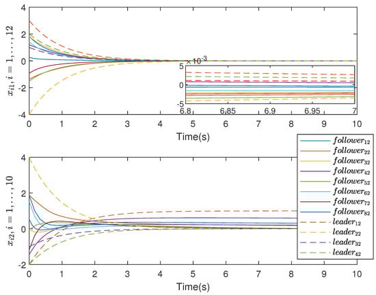 To check the accuracy of the theoretical findings, we employ a simulation example in this section. Consider a multi-agent system with eight followers and four leaders to demonstrate the use of the control protocol. The dynamics of each agent are described by Equations (3) and (4), where , , . The initial states of each follower and leader are set to , , , , . It is possible to choose the parameter , system matrices A and B, and matrix Q with positive definiteness, as follows: