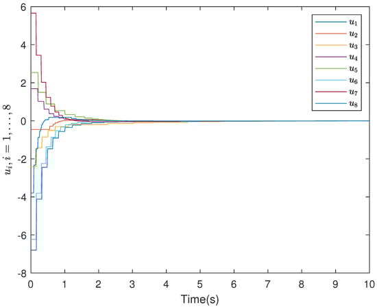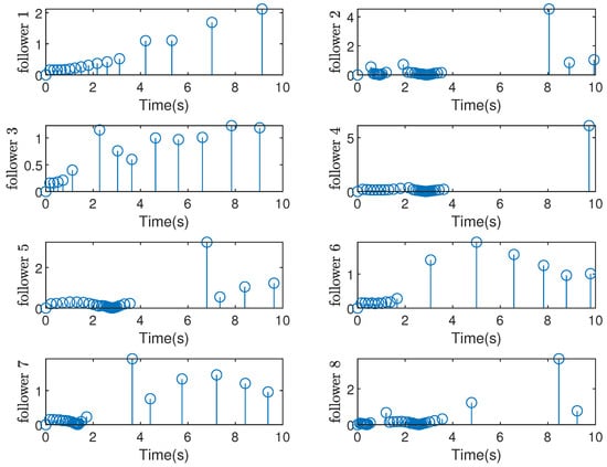 Figure 3 shows the change in the state trajectory of the multi-agent system. It can be seen that all followers gradually converge to the convex hull formed by the leader state, indicating that the control method is effective. The control input is shown in Figure 4. When t = 4 s, the control input tends to be stable, indicating that the controller remains stable in the subsequent period, which further proves that the containment control problem of the system is solvable (3). Figure 5 shows the instants and intervals of event triggering. The line indicates whether the event is triggered (if triggered, there are line circles), and the vertical distance of a single circle is the interval time between the triggering and the previous moment.It can be seen that the followers have no Zeno phenomenon (i.e., continuous points) and the trigger interval is long, indicating that the control scheme effectively reduces the communication.